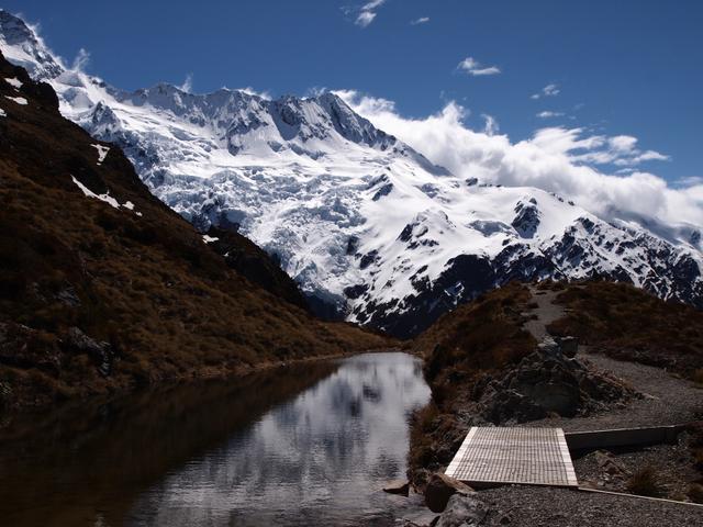 另一条则是需3-4小时来回的步道Sealy Tarns,这条步道比较陡峭,需要一些体力,短时间内爬升高度比较多。但展望很棒,可以看到胡克峡谷(Hooker Valley) 和群山山峰。步道维护得很好,较陡的路段设有阶梯。这两条步道各以不同的角度和方向欣赏库克群山,视野非常开阔美不胜收。