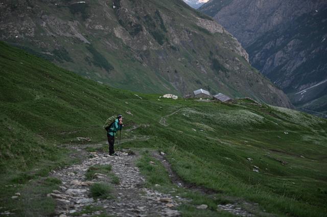 看见前面的小屋,满心欢喜以为到了目的地,再看清楚地图,原来前面峡谷的位置才是真正的终点,真是晴天霹雳。可能是之前避雨避得太久,雪地上前进速度有比想像中慢,最后比计划慢了好几个小时,到晚上10时才到达Les Chapieux。幸好这边日照时间比较长,到达的时候天刚好全黑。