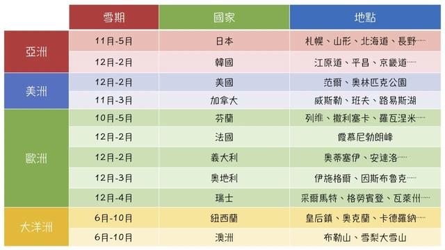 大部分的滑雪场都是从12月开放到2月底左右,不过也会随着海拔的高低会提早在11月开放,延后到4月才关闭,选择滑雪地点的时候,可以参考一下雪期的时间,挑选最适合的国家以及配合自己想要做的滑雪运动,看是比较喜欢单板滑雪是一般滑雪去做滑雪场的选择哦~欧洲的滑雪场,多的跟雪片一样多,在东南西北欧都精选一处,提供大家参考雪期。
