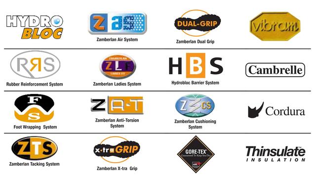 下图列出Zamberlan已使用的技术图样。多样的技术展现出Zamberlan在制鞋上的技术层次,与多年的经验累积。